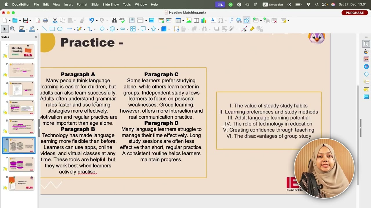 By the end of the course, students will have practiced extensively, mastered all question types, and developed the confidence, fluency and strategies needed to achieve their target IELTS band score.